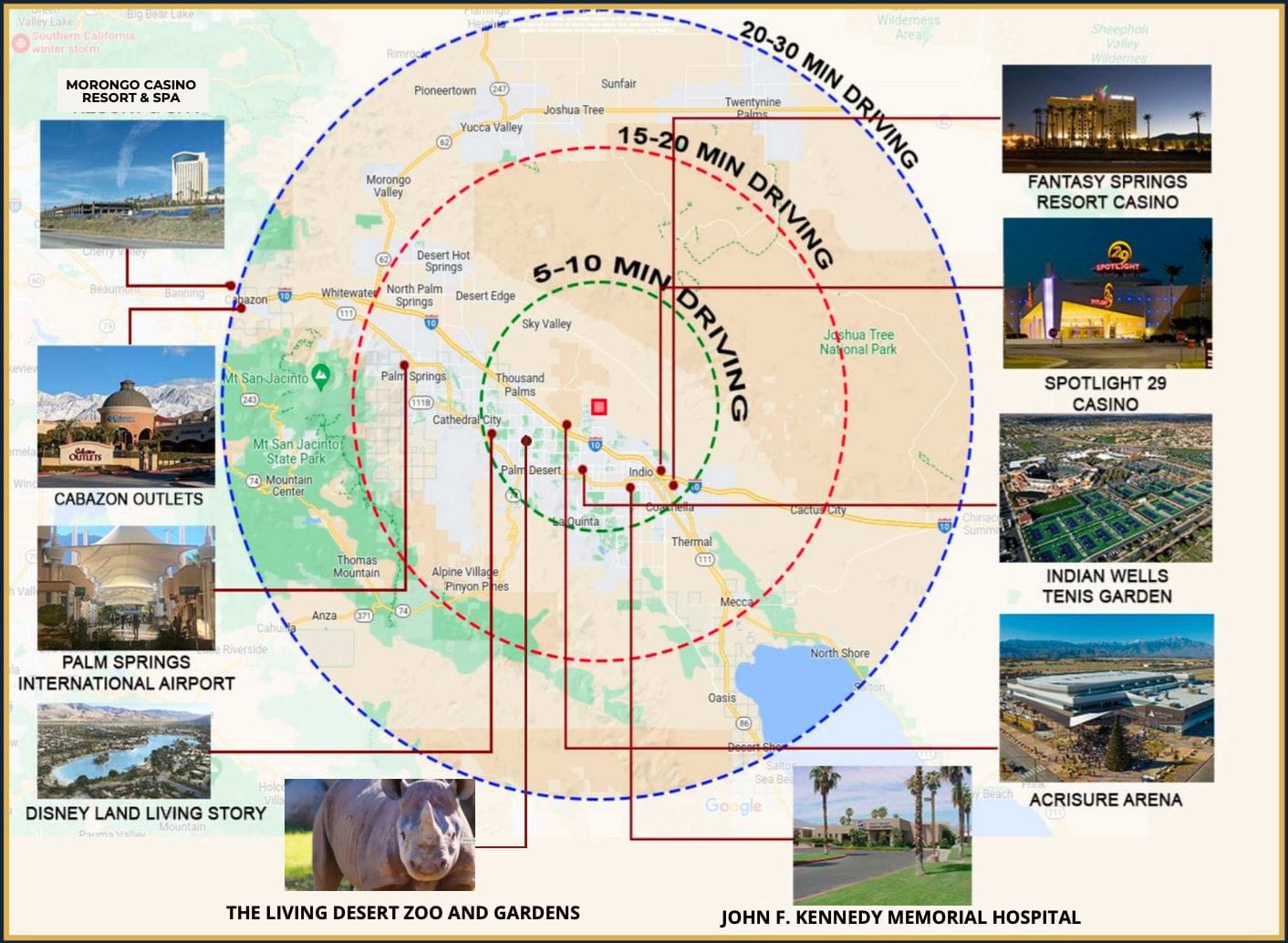 Within a 5-30 minute drive from Indio, you can enjoy world-class casinos & resorts, shopping outlets, and renowned sporting venues.